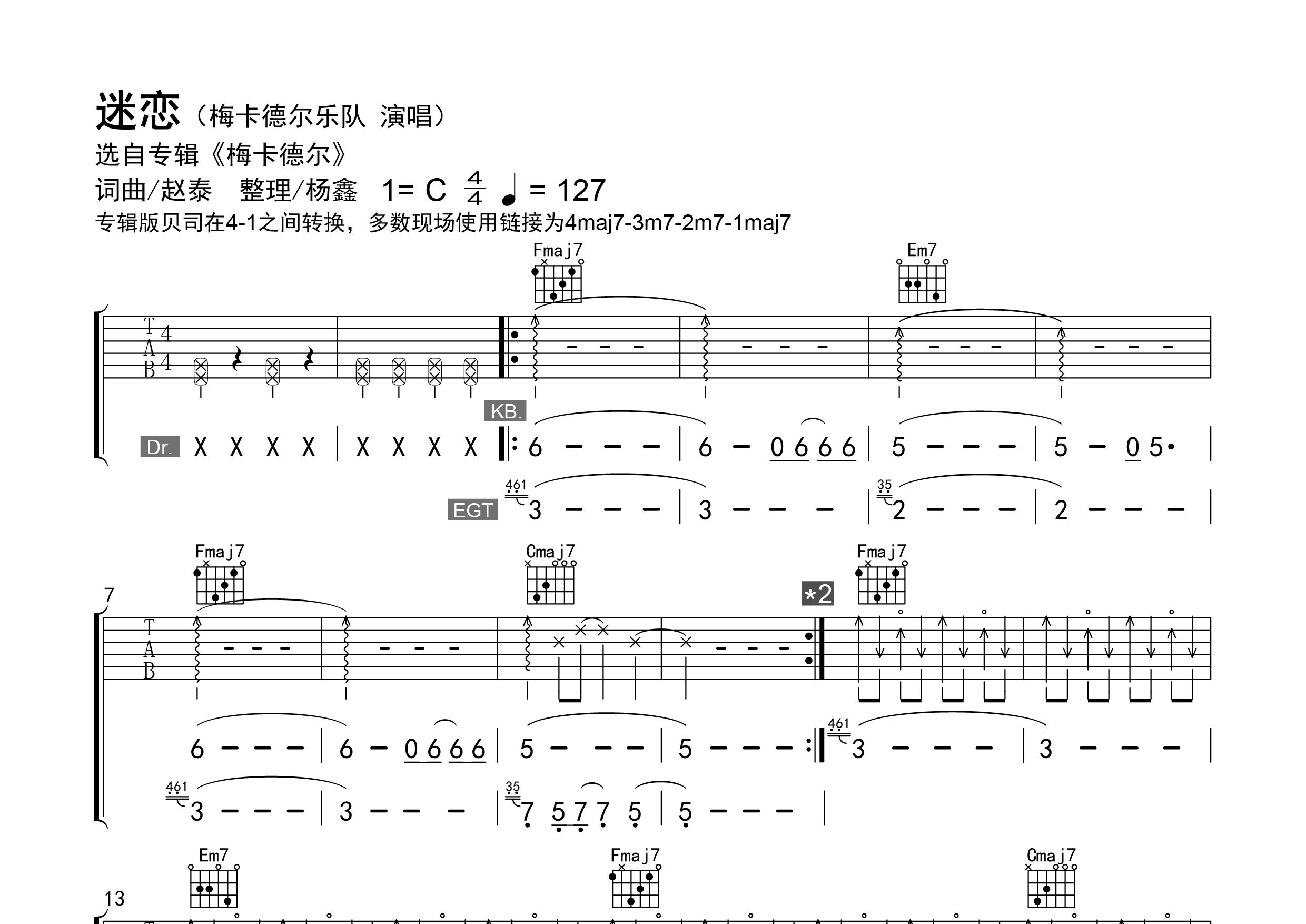 | 【调弦】标准调弦。 【基本信息】原曲C调,选调C,每分钟127拍。 【编配情况】根据原曲精细整理。 【和弦难度】常规和弦,Bass部分改编为了连复段。 【节奏难度】最小时值8分音符,含少量切分节奏、含拍弦、滑音、切音等技巧。 【难点】拍弦技巧与Bass改编的连复段。 【技巧说明】拨弦带框为【拍弦】;空心圈为【切音】(或处理为哑音);S为【滑音】,拨弦后加注斜杠为【无尾滑音】。 |
