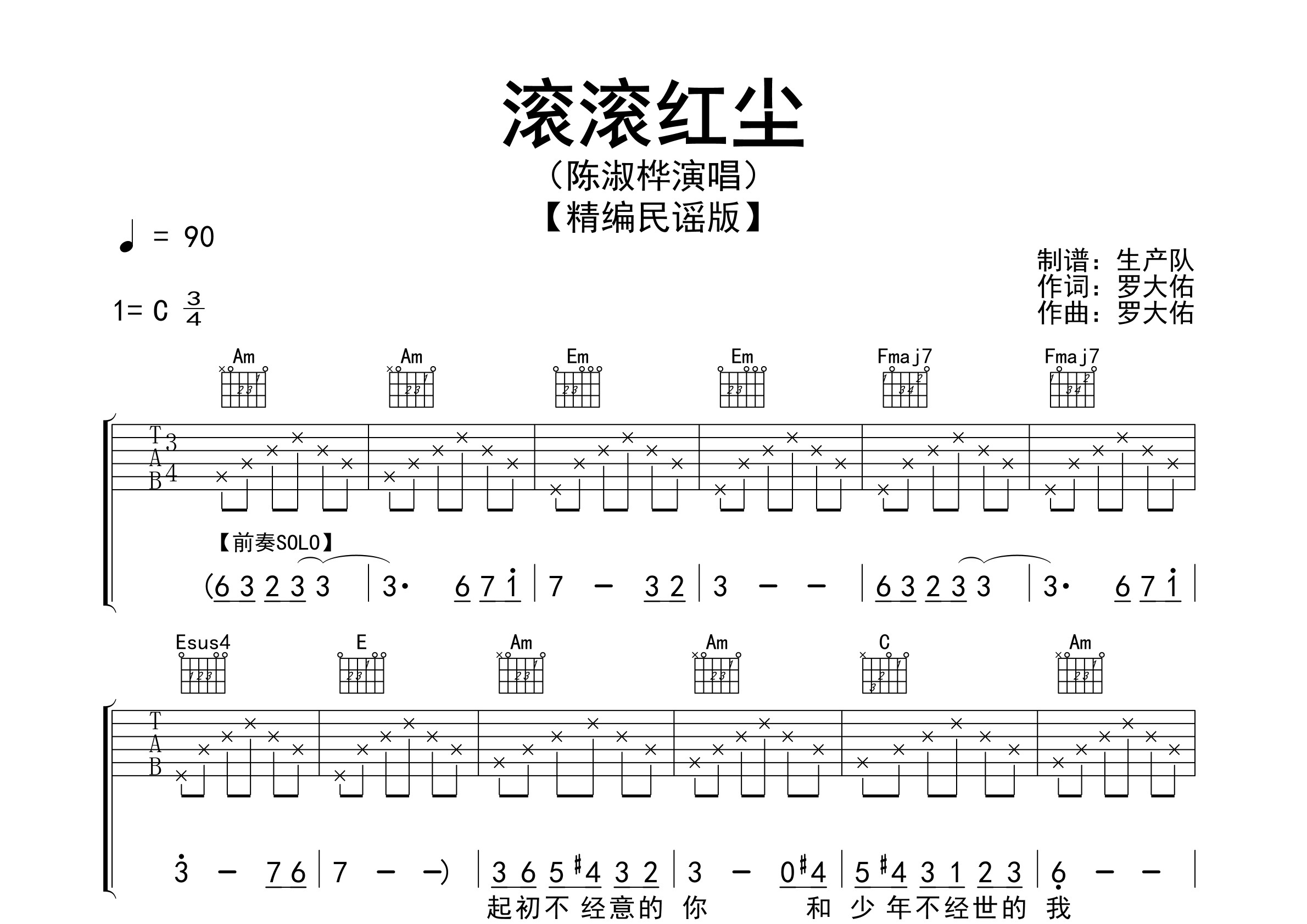 | 本帖最后由 生产队 于 2023-8-30 20:25 编辑 《滚滚红尘》是一首由罗大佑作词、作曲,陈淑桦演唱的歌曲,收录在陈淑桦1990年的专辑《一生守候》中 ,该歌曲还是1990年台湾电影《滚滚红尘》的同名主题曲。本吉他谱根据原版C调指法编配的民谣版本,精准的前奏、间奏、尾奏及SOLO编配,值得推荐学习的经典作品! |