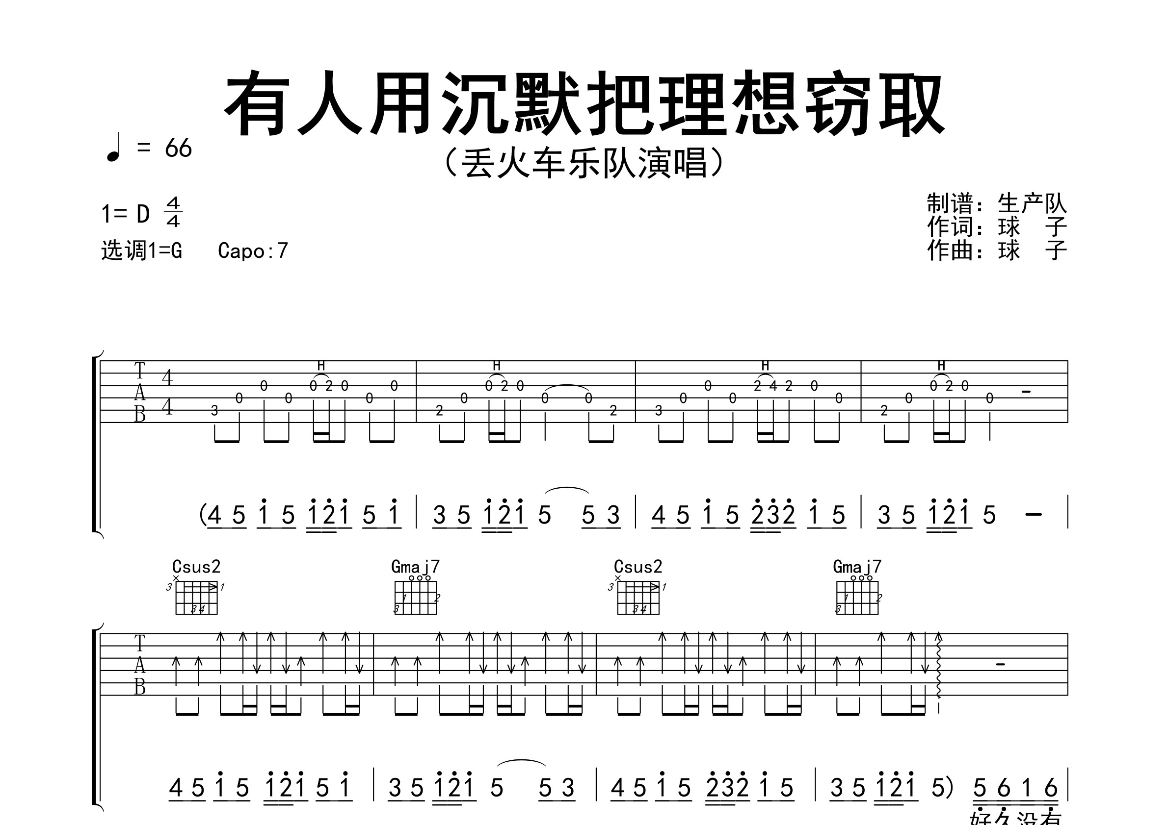 《有人用沉默把理想窃取》丢火车乐队演唱歌曲。本吉他谱根据原版采用G调指法编配,完整的前奏、间奏、尾奏和SOLO编配,精编完美版,值得推荐!