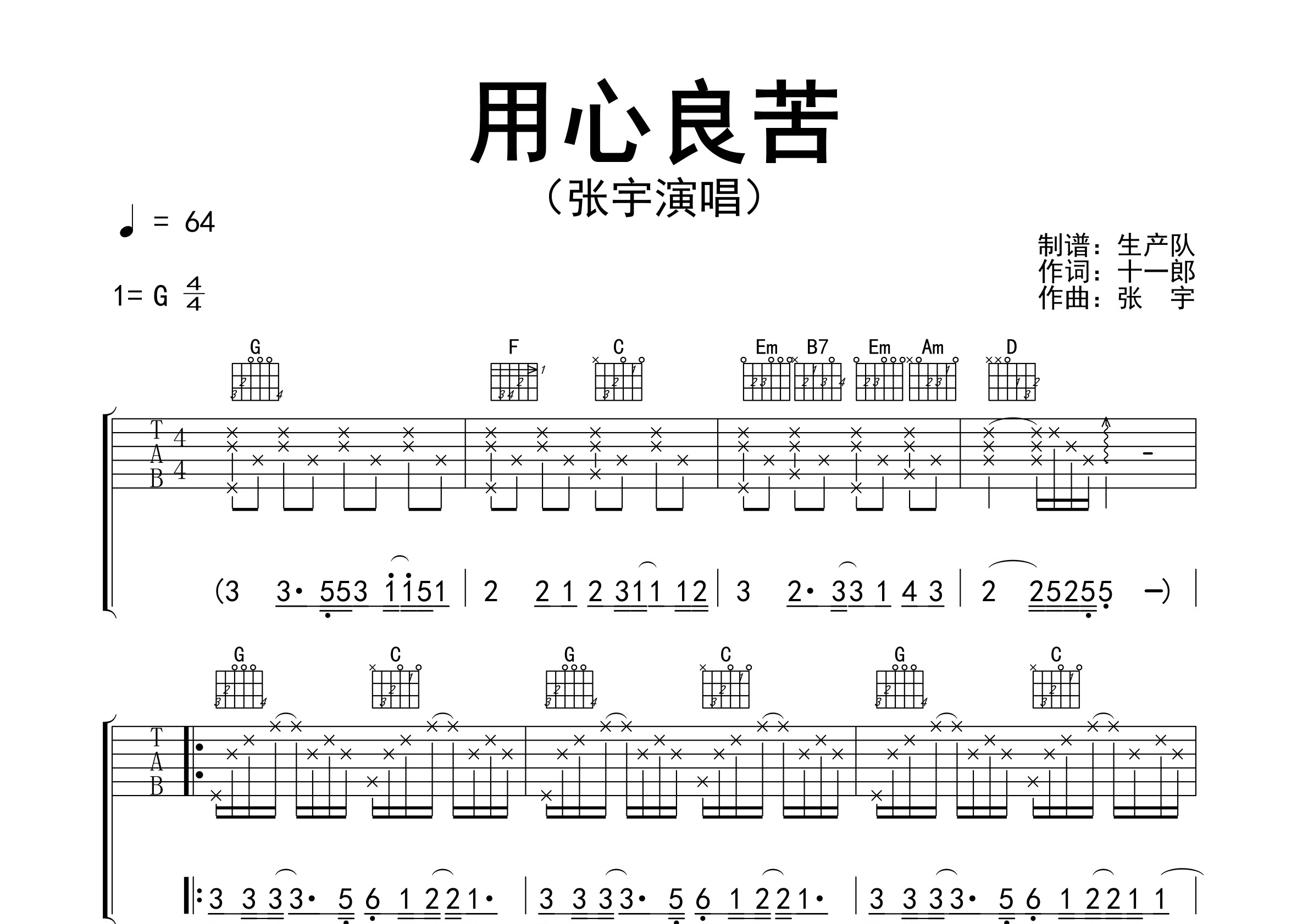 《用心良苦》是由十一郎作词,张宇作曲并演唱的歌曲,1994年,张宇凭借该曲获得新加坡醉心金曲奖最佳作曲奖 。本吉他谱根据原版G调指法编配,完整的前奏、间奏和solo编配,怀旧经典!
