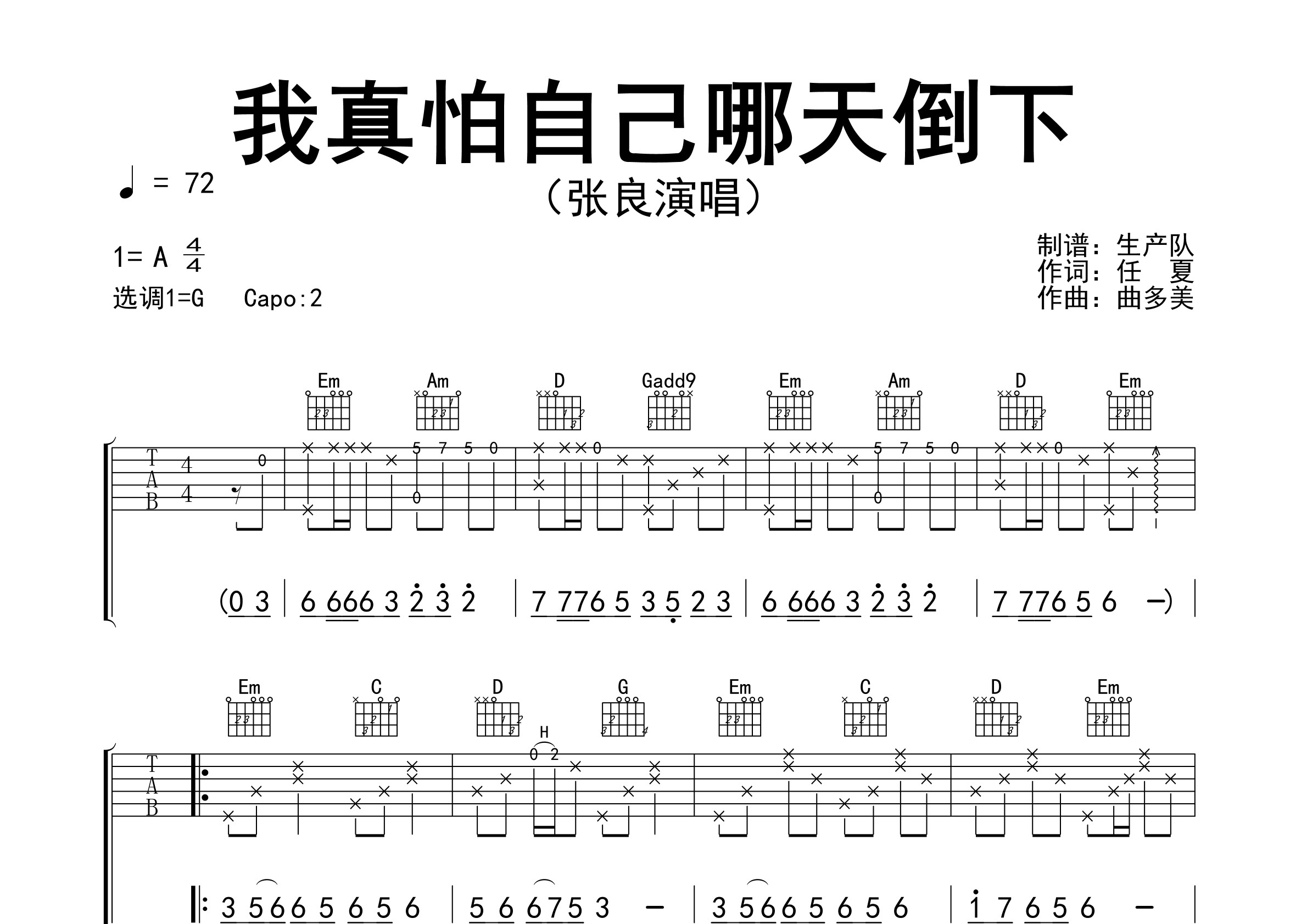 张良翻唱的歌曲《我真怕自己哪天倒下(烟嗓男版)》原版吉他谱,精准的前奏、间奏solo编配,精编完美版,值得推荐!