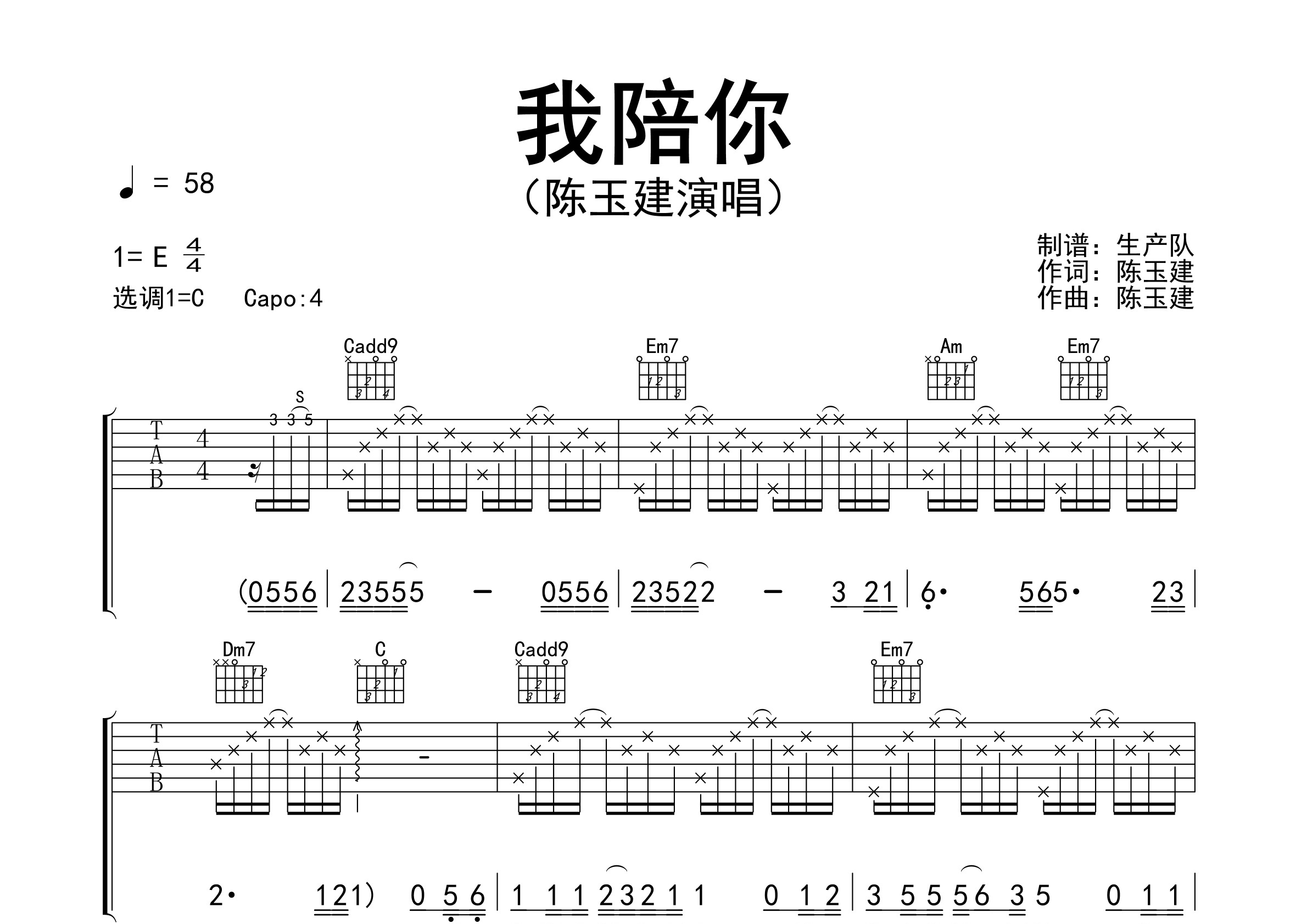 陈玉建作词、作曲并演唱的歌曲《我陪你》原版吉他谱,完整的前奏、间奏solo编配,精编完美版,值得推荐!