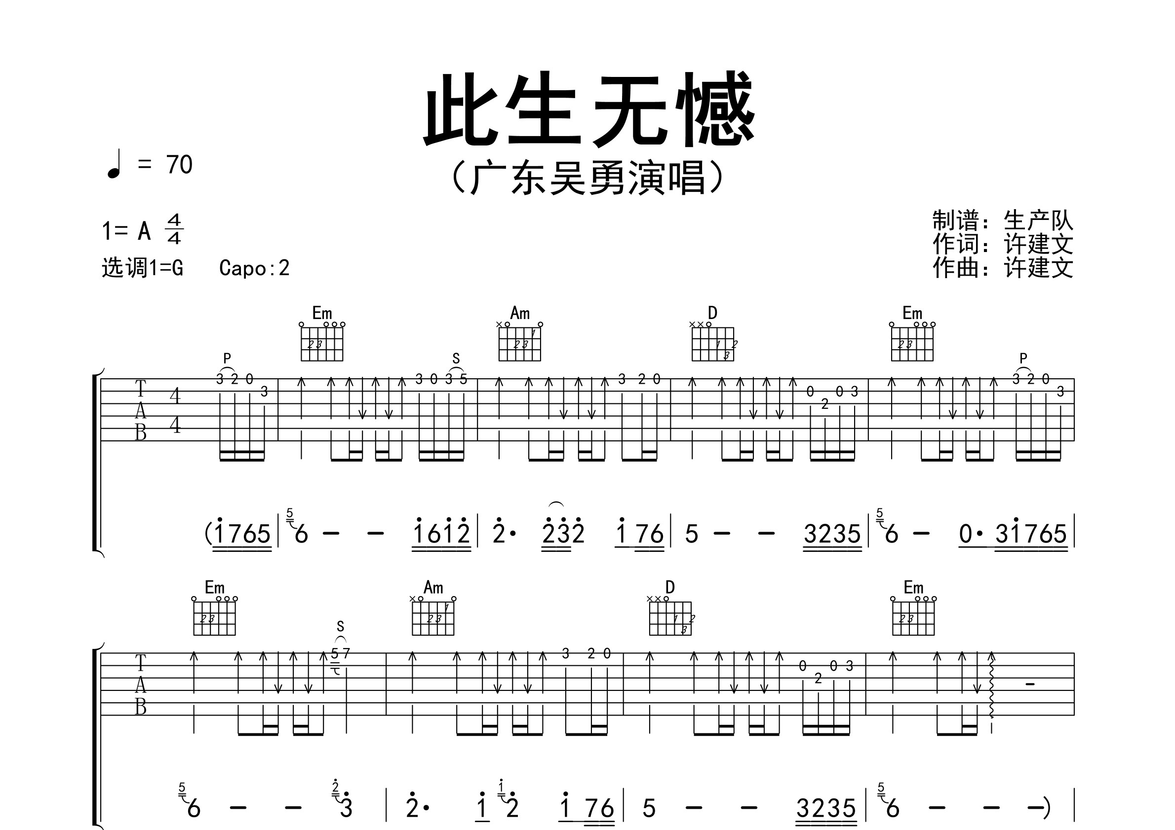 广东吴勇演唱的歌曲《此生无憾》原版吉他谱,精准的前奏、间奏、尾奏solo编配,精编完美版,值得推荐!