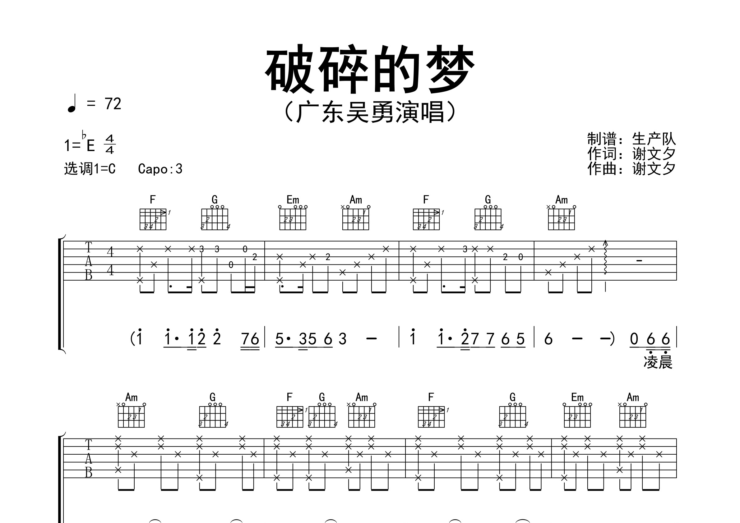 广东吴勇演唱的歌曲《破碎的梦》原版吉他谱,精准的前奏、间奏、尾奏solo编配,精编完美版,值得推荐!