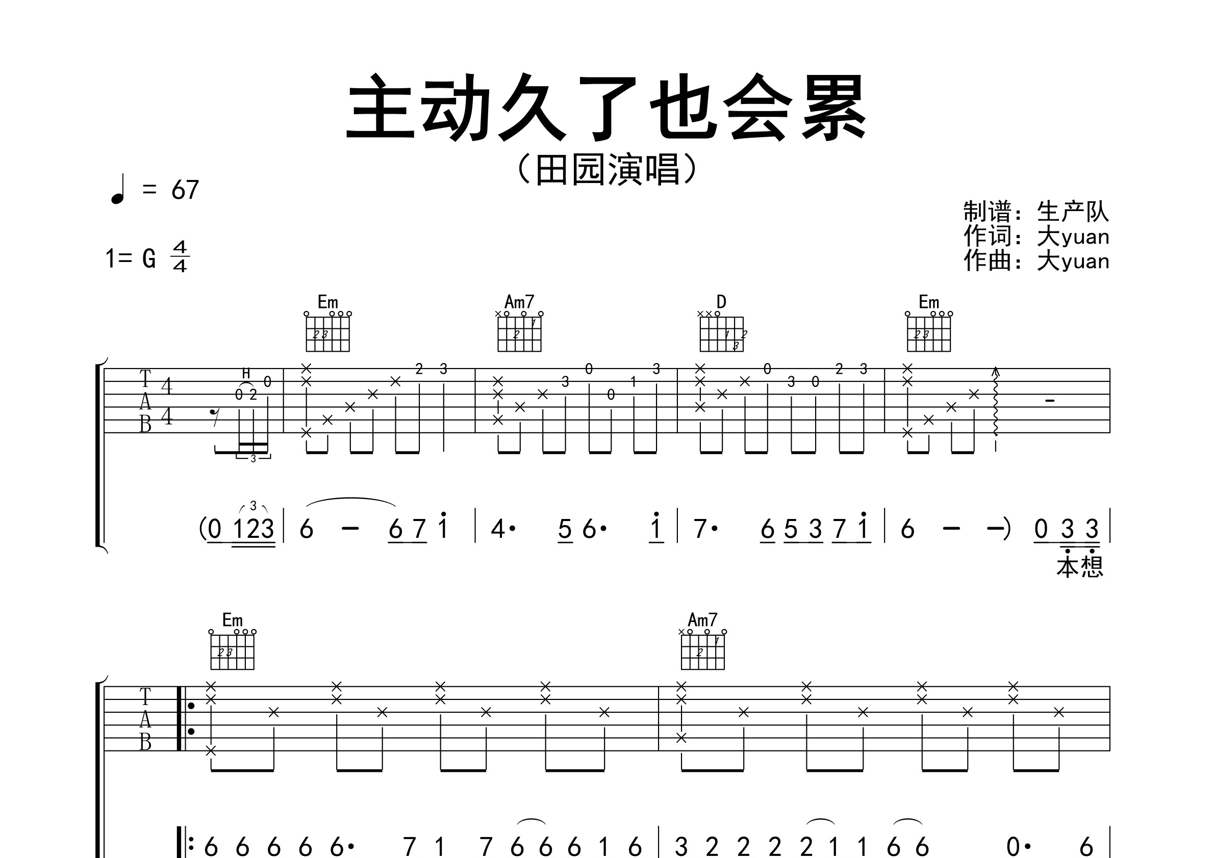 田园演唱的歌曲《主动久了也会累》原版吉他谱,含前奏、间奏、尾奏solo编配,精编完美版,值得推荐!