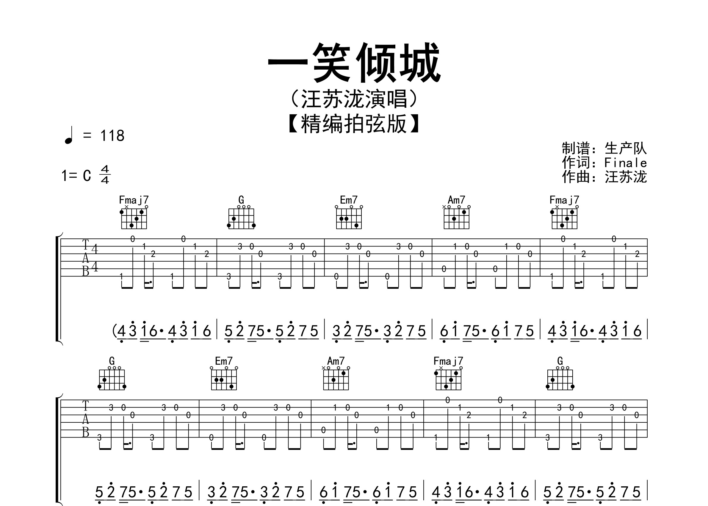 汪苏泷演唱的歌曲《一笑倾城》原版吉他谱,精准的前奏、间奏、尾奏solo编配,精编拍弦版。该曲也是电视剧《微微一笑很倾城》的片头曲、推广曲,怀旧经典!