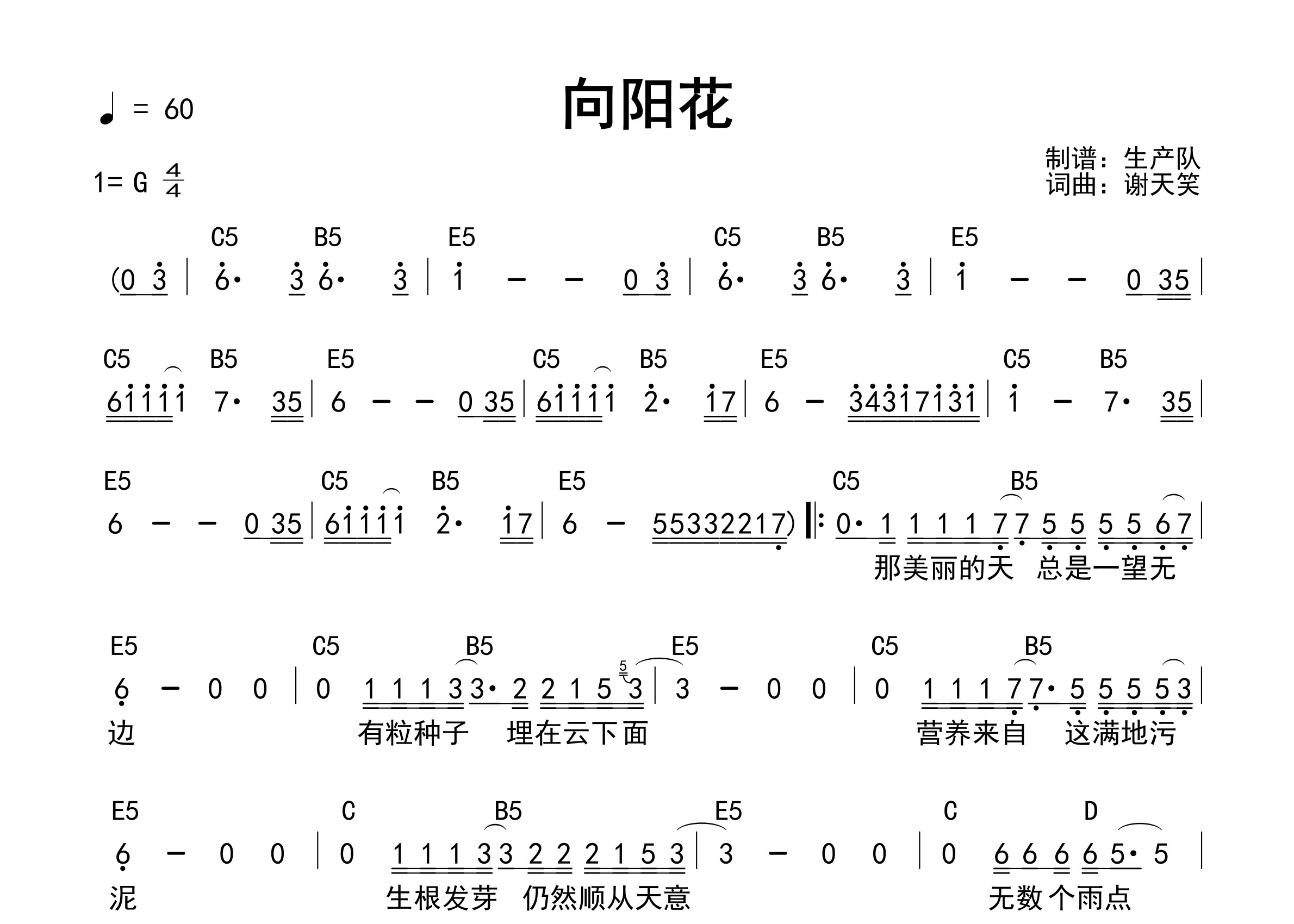 谢天笑演唱的经典歌曲《向阳花》和弦弹唱谱。