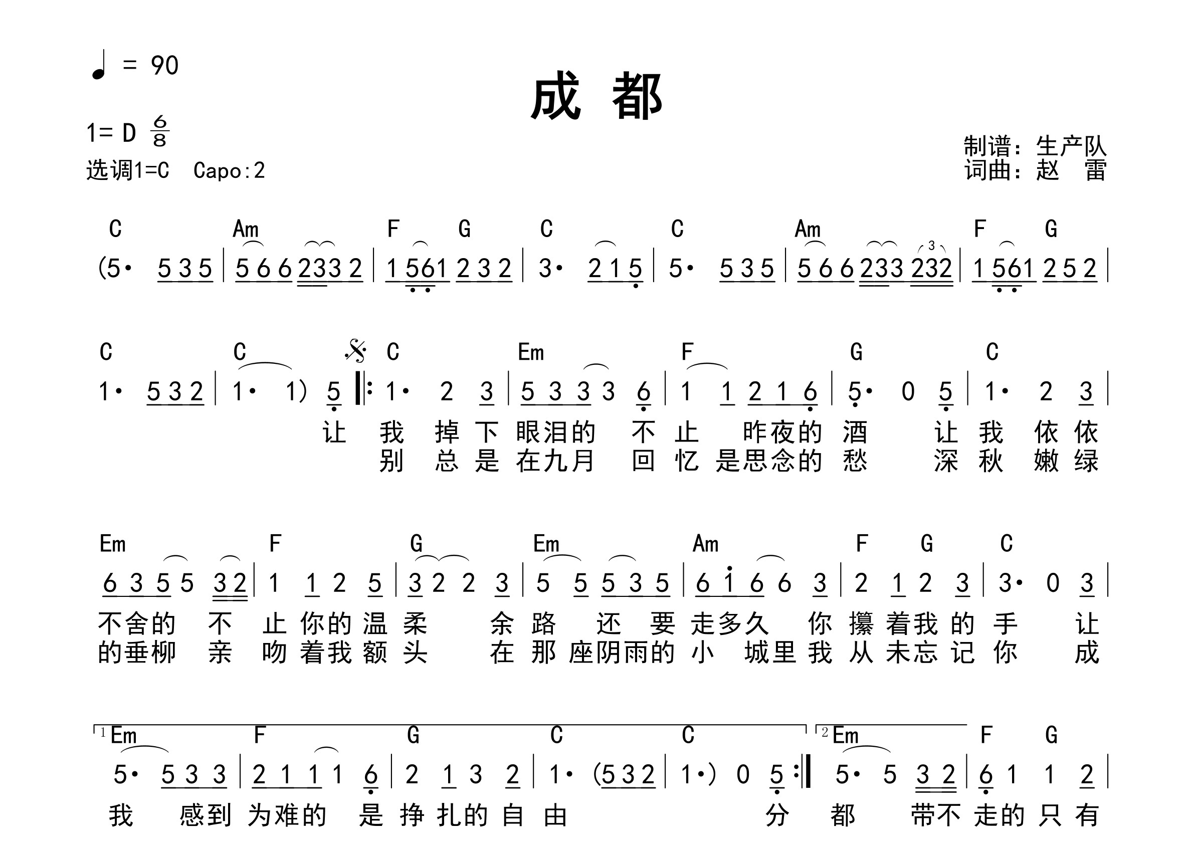赵雷演唱的经典歌曲《成都》和弦弹唱谱。