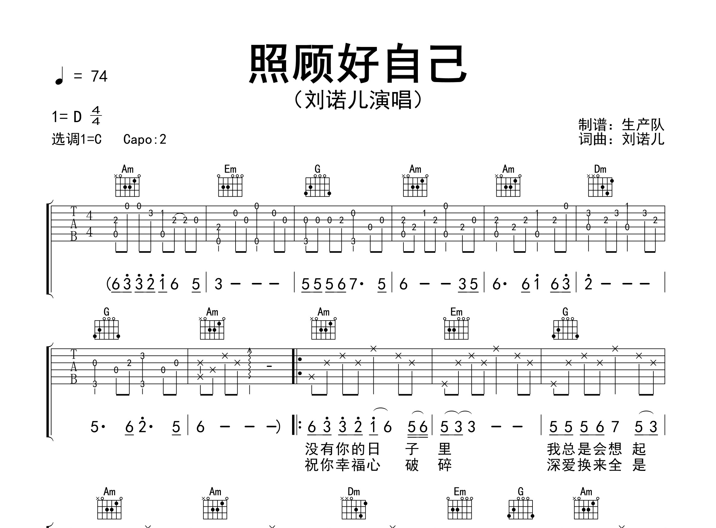 刘诺儿演唱的歌曲《照顾好自己》原版吉他谱,含精准的前奏、间奏、尾奏solo编配,精编完美版,优质推荐!