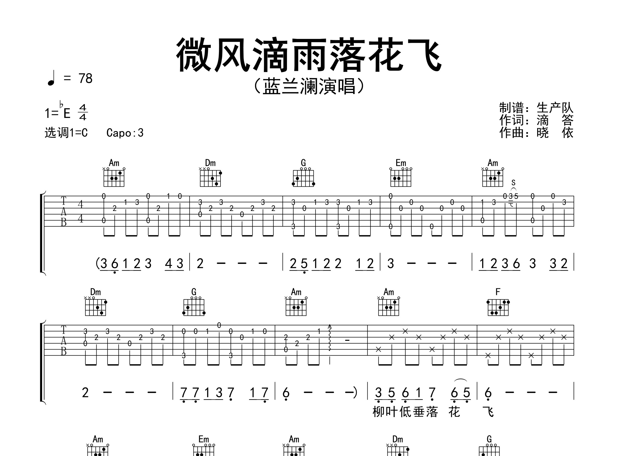 蓝兰澜演唱的歌曲《微风滴雨落花飞》原版吉他谱,含精准的前奏、间奏、尾奏solo编配,精编完美版,优质推荐!