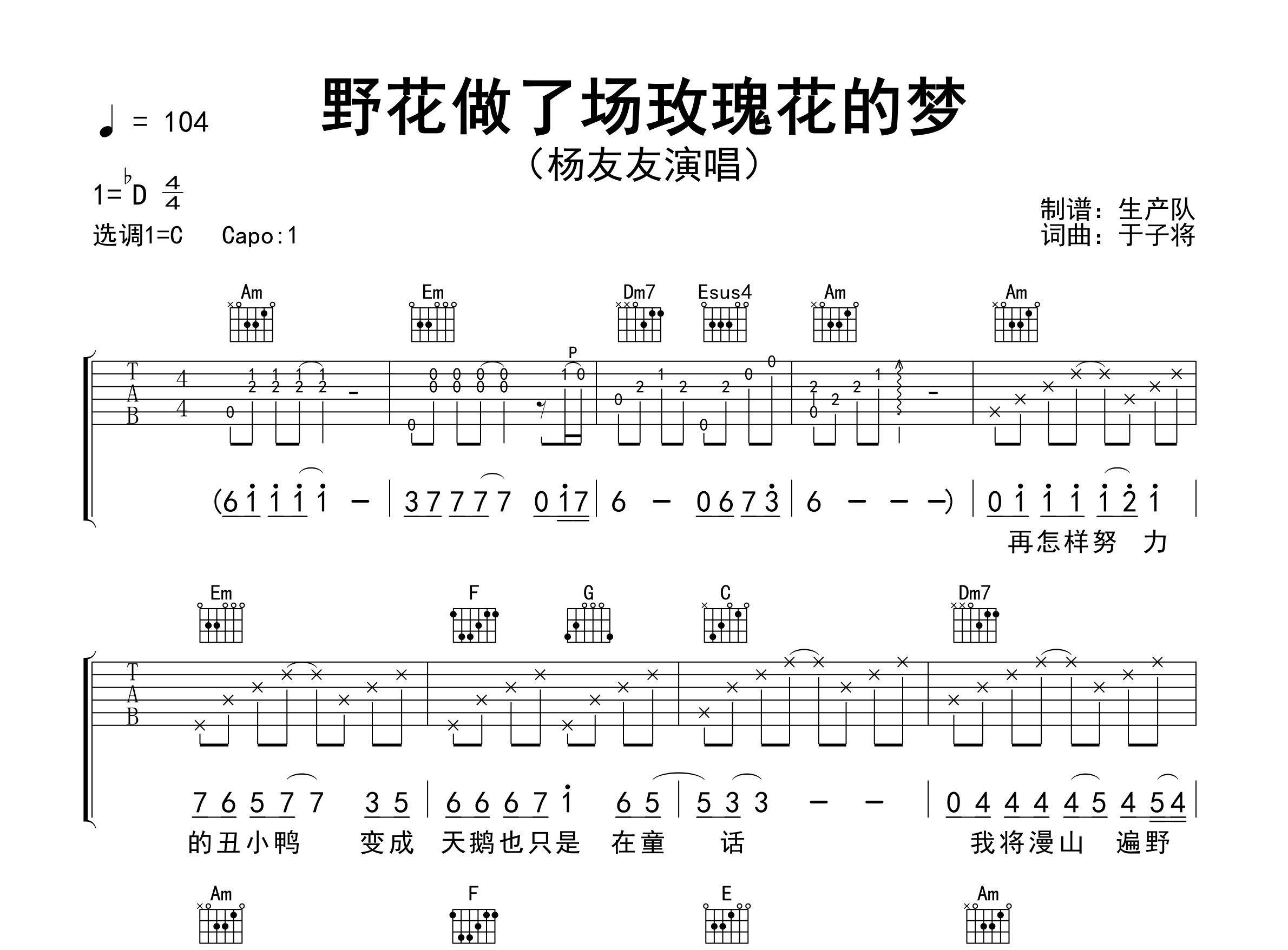 杨友友演唱的歌曲《野花做了场玫瑰花的梦》原版吉他谱,含精准的前奏、间奏solo编配,精编完美版,优质推荐!