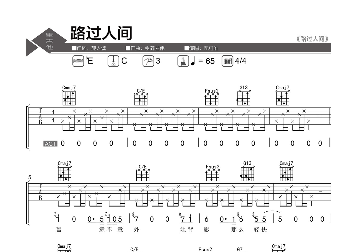 | 本帖最后由 老杨教吉他 于 2024-2-17 11:54 编辑 【调弦】标准调弦。 【基本信息】原曲bE调,选调C,变调夹夹3品,4/4拍,每分钟65拍。 【编配情况】根据原曲精细整理。 【和弦难度】和弦的特殊按法、不常用和弦、大跨度和弦、大横按。 【节奏难度】最小时值32分音符,含少量附点时值。 【难点】和弦的熟练,弹唱的配合。 【技巧说明】空心圈为【哑音】;A.H为【人工泛音】。 |